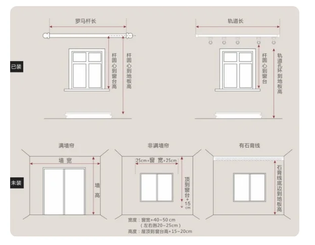 非整面墻的窗簾寬度應在窗框寬度基礎上兩側各余出15~30cm,可保證窗簾拉上時,兩側無縫隙漏光;整面墻窗簾的測量寬度可為墻體寬度。